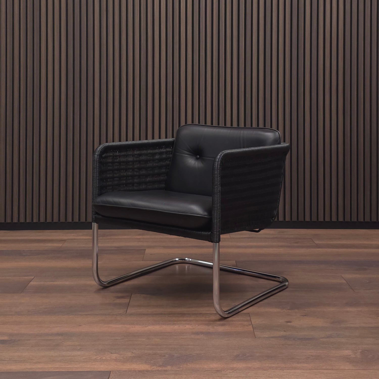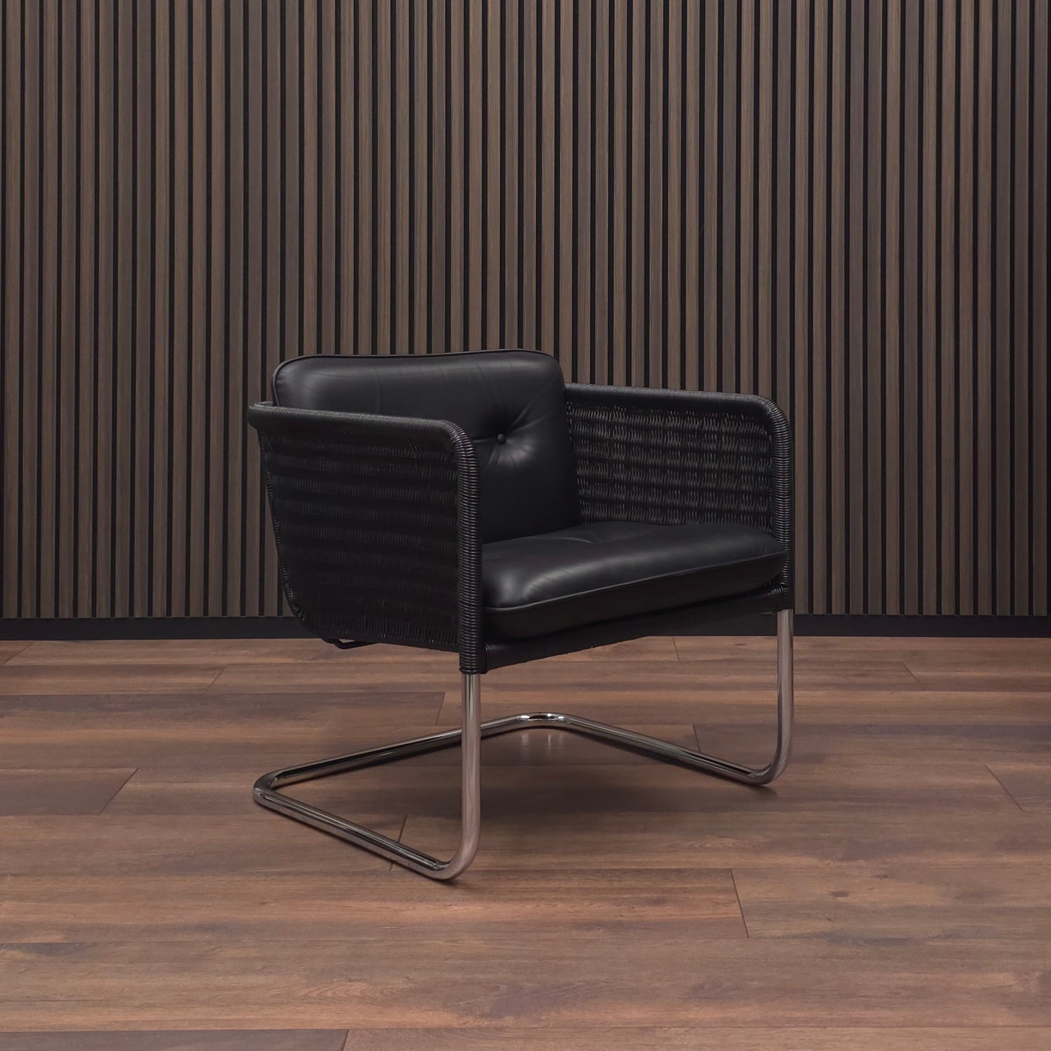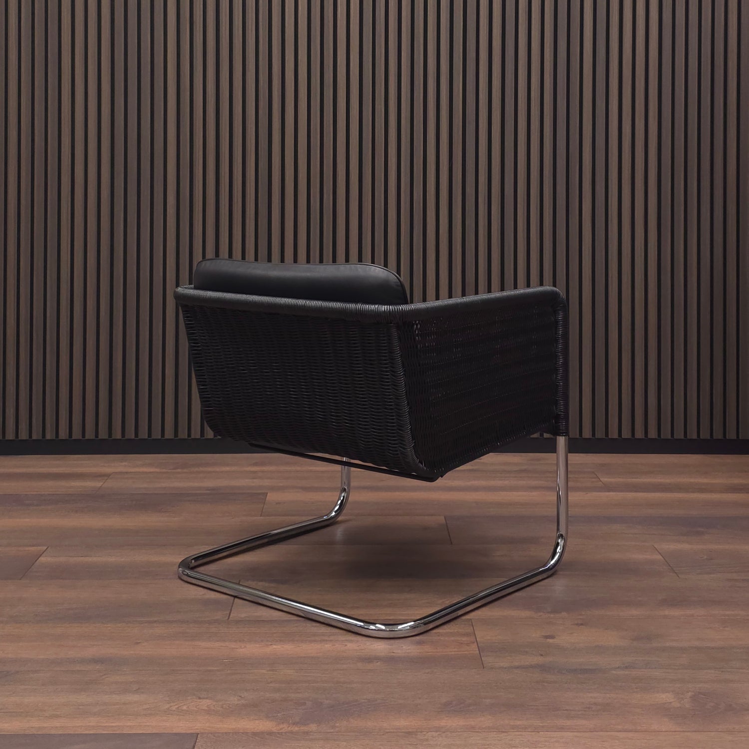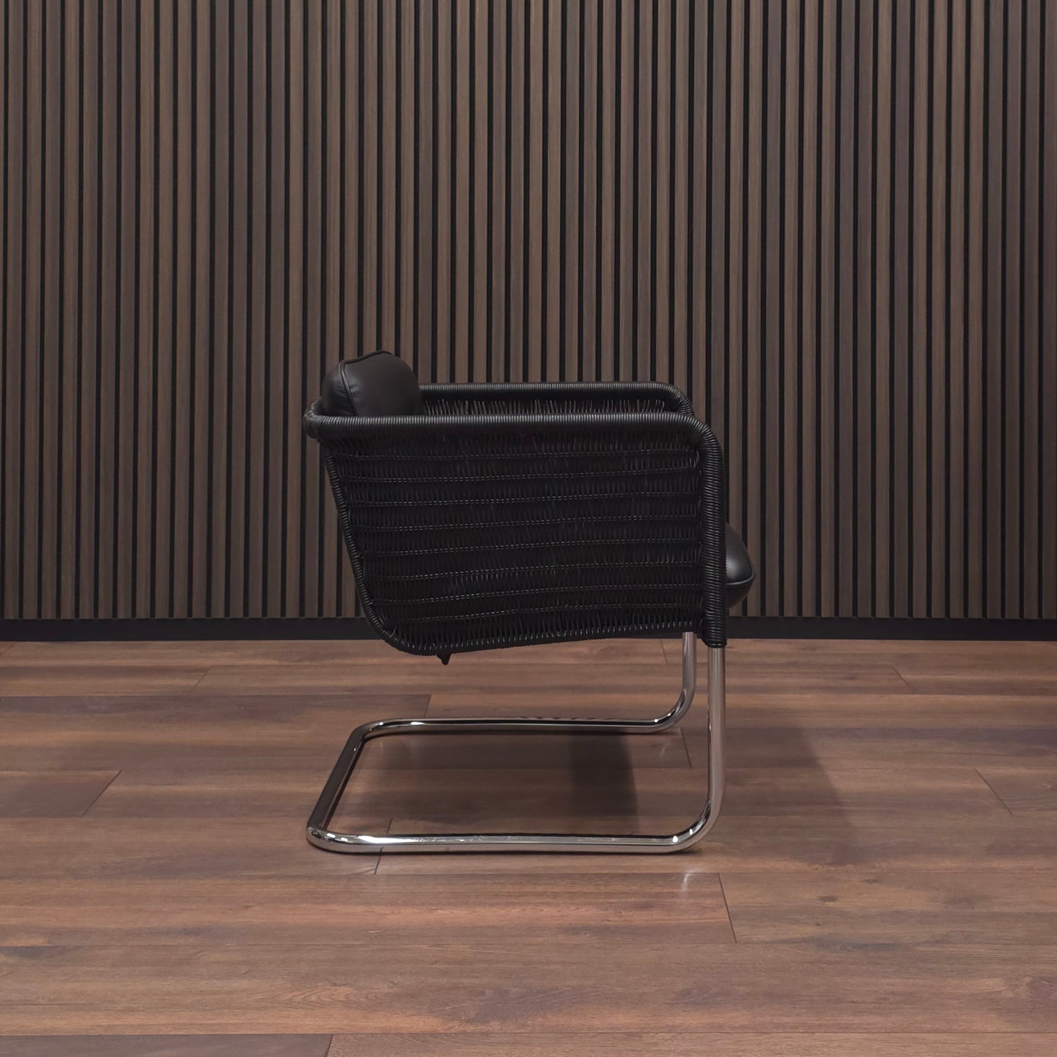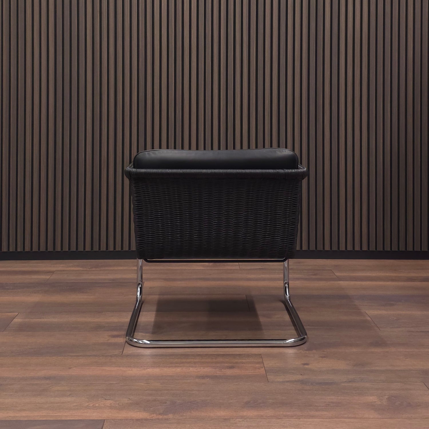 Original TECTA Kragsessel in schwarz, Modell D44, entworfen in den 1960er-Jahren vom Schweizer Architekten William Dunkel. Charakteristisch ist das freischwingende Stahlrohrgestell mit Sitz- und Rückenflächen aus schwarzem Echtleder. Der Sessel steht exemplarisch für funktionales Design mit Bauhaus-Einfluss. Produziert von TECTA (Lauenförde, Deutschland), einem führenden Hersteller