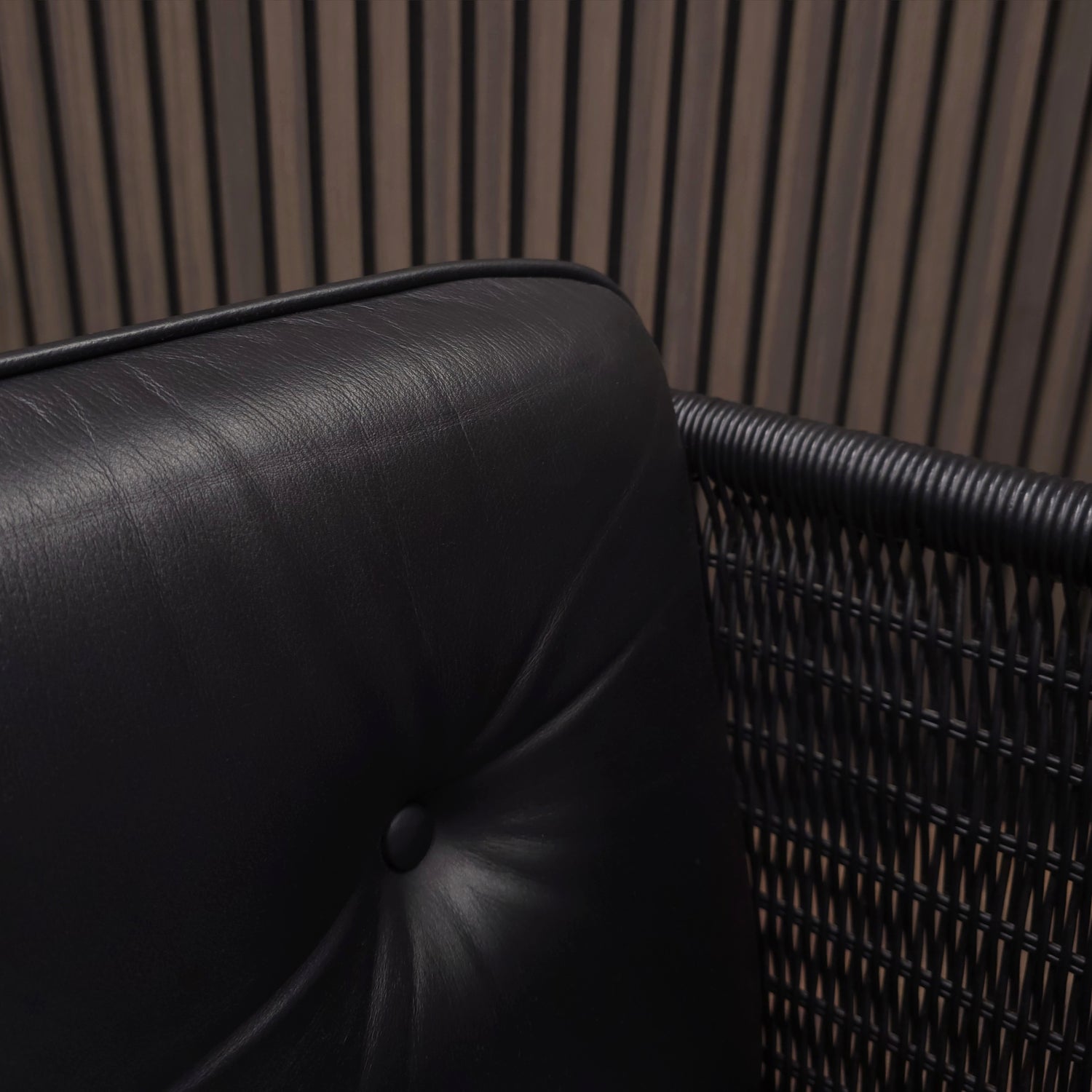 Der Sessel befindet sich in einem dem Alter entsprechend sehr guten Zustand. Besonders hervorzuheben ist das Geflecht, das frei von Beschädigungen oder Bestoßungen ist – eine Seltenheit bei einem Möbelstück dieses Alters. Die originale Echtlederpolsterung zeigt lediglich normale Gebrauchsspuren, wie sie bei sachgemäßer Nutzung über die Jahre entstehen, ohne dabei den Gesamteindruck zu beeinträchtigen. Die Polsterung selbst ist straff und formstabil geblieben und bietet noch heute denselben hohen Sitzkomfort wie zur Zeit der Herstellung.