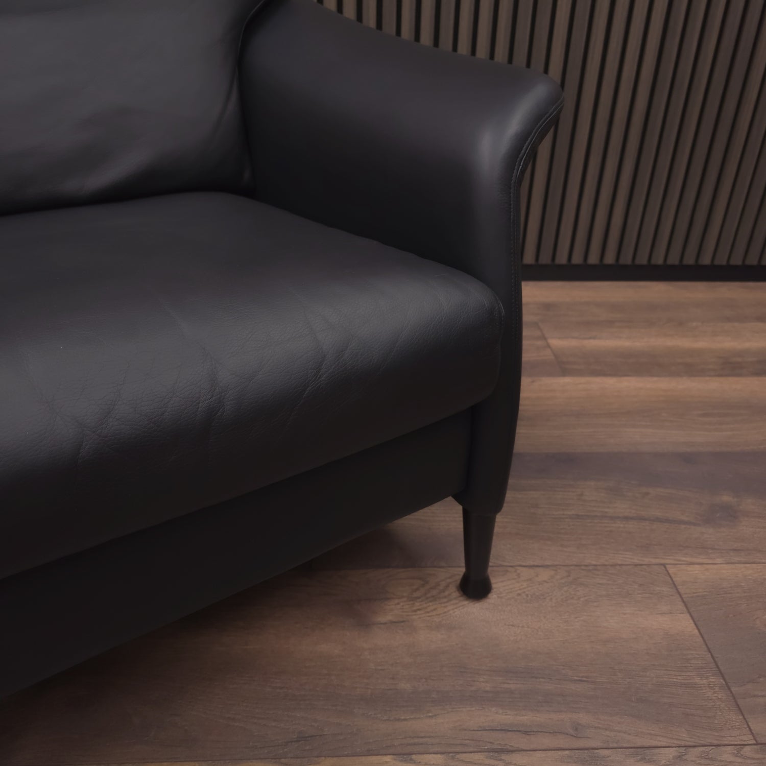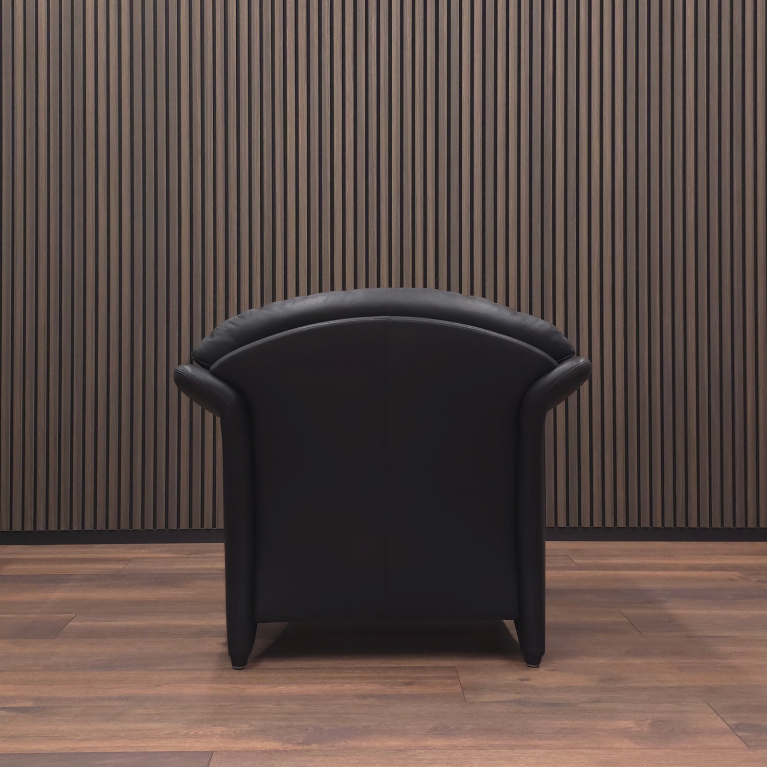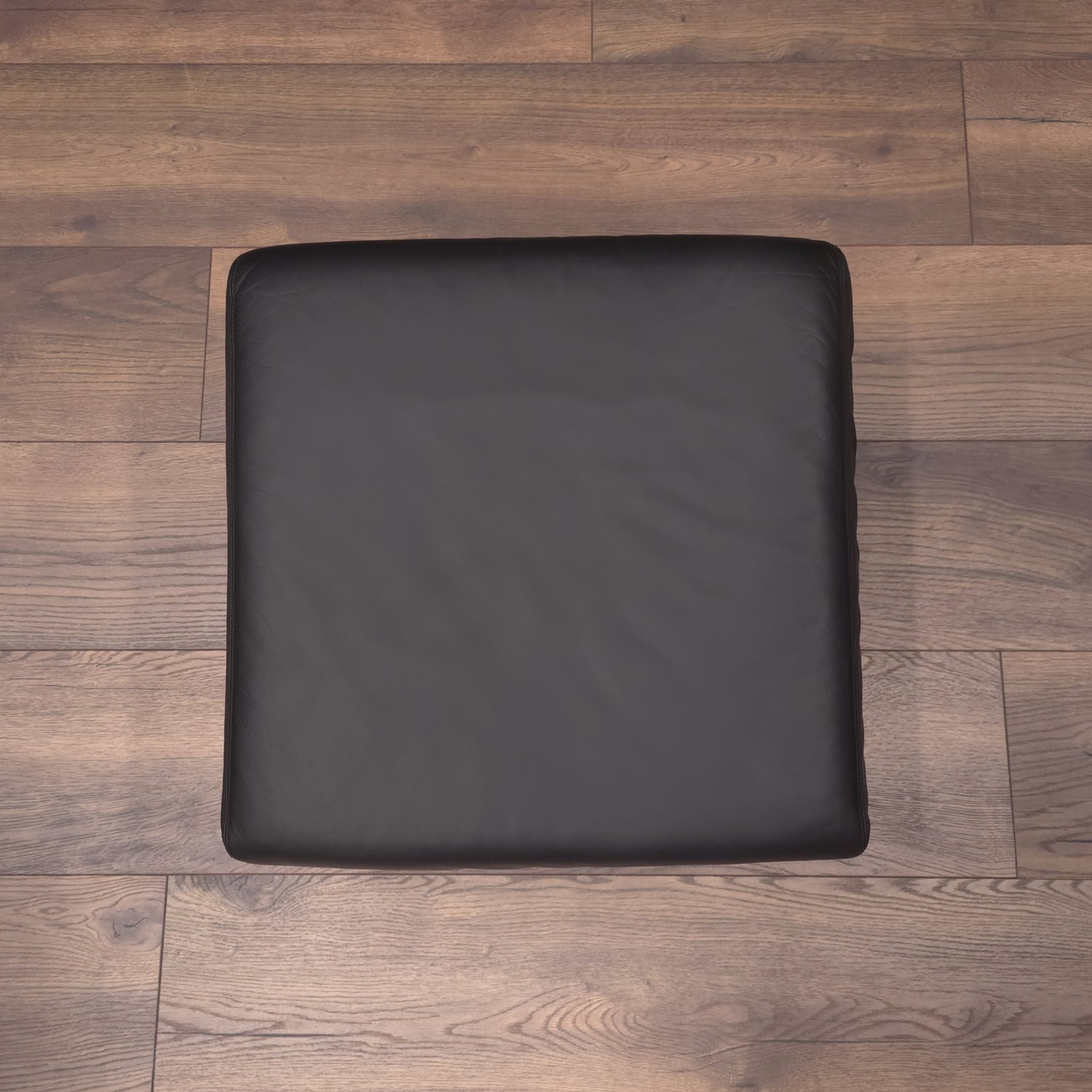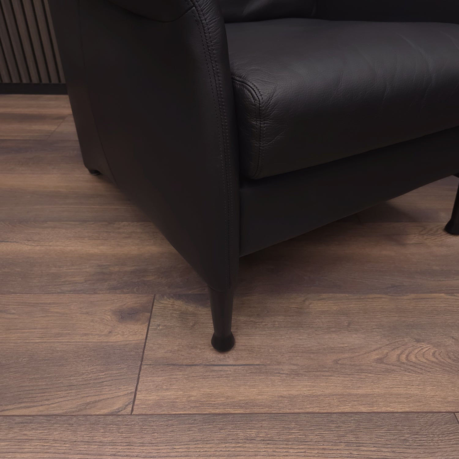 Gefertigt aus feinstem schwarzen Echtleder, überzeugt der Lounge Chair durch eine edle Haptik und eine langlebige Oberfläche. Die leicht geschwungene Linienführung, kombiniert mit der großzügigen Polsterung, sorgt für ein luxuriöses Sitzerlebnis. Der dazugehörige Ottomane ergänzt den Sessel perfekt und lädt zum Hochlegen der Beine ein, wodurch ein vollständiges Loungemöbel-Ensemble entsteht.